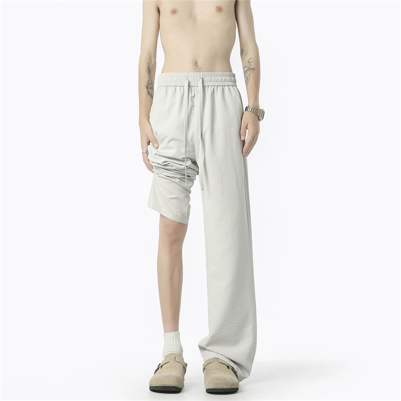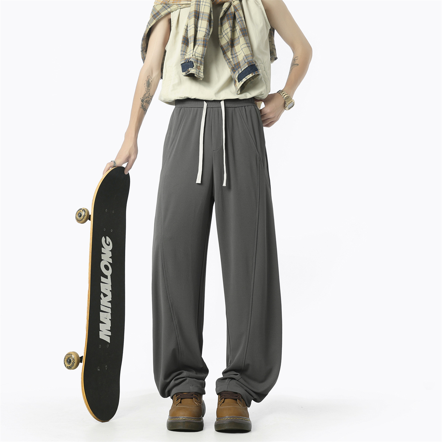 2025 新しい夏の斜めカーブパンツ速乾性アイスシルクパンツメンズ香港スタイルドレープルーズストレートカジュアルパンツエアコン