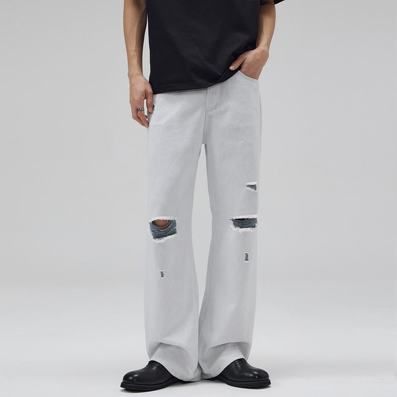 2025 春夏オールドマネーブルーガーゼリッピングホワイトジーンズメンズルーズ A ラインスリムで背の高いパンツトレンディ