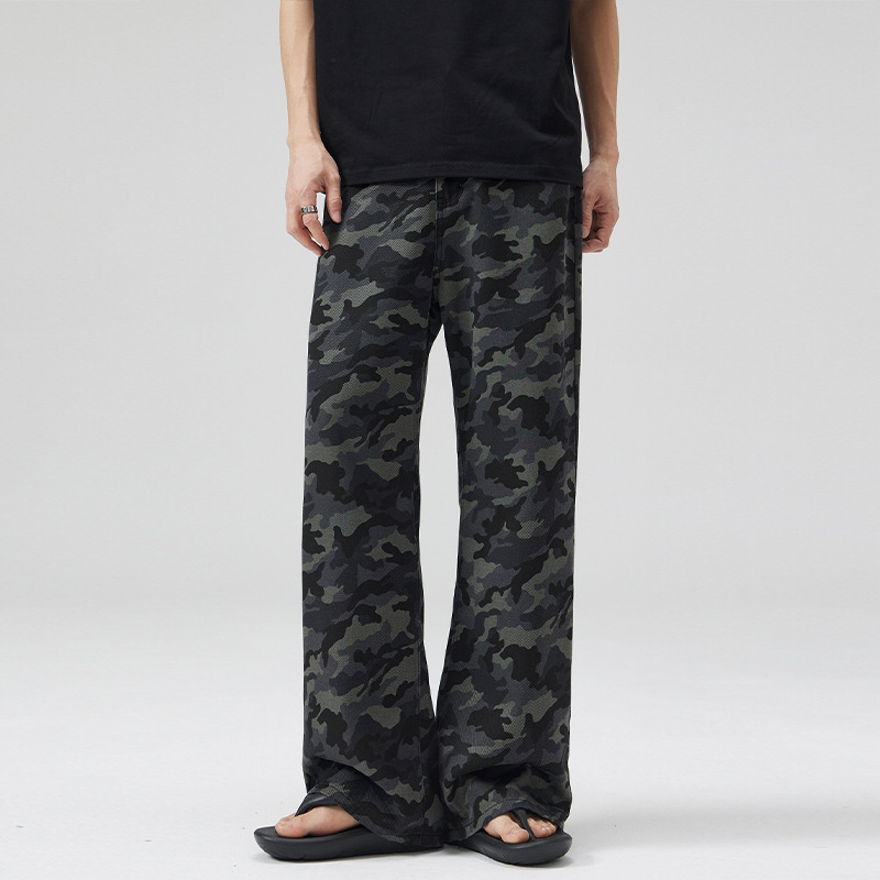 2025 春夏アメリカン弾性ウエスト迷彩カジュアルジーンズメンズルーズストレート A ラインバイブ個性多用途パンツ