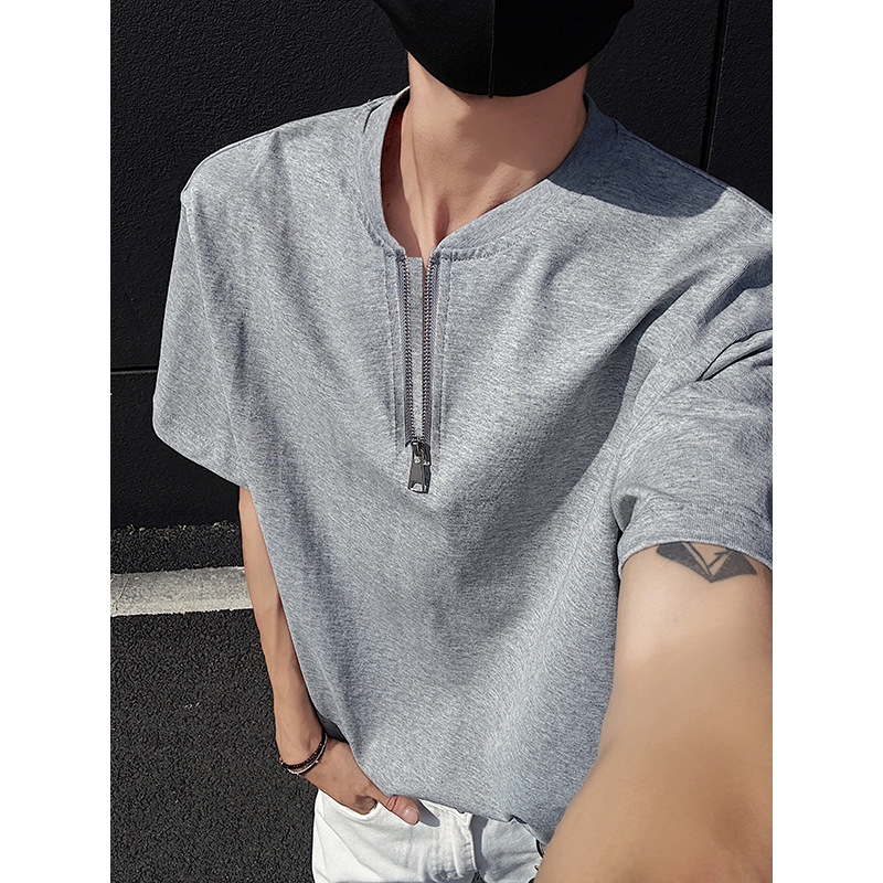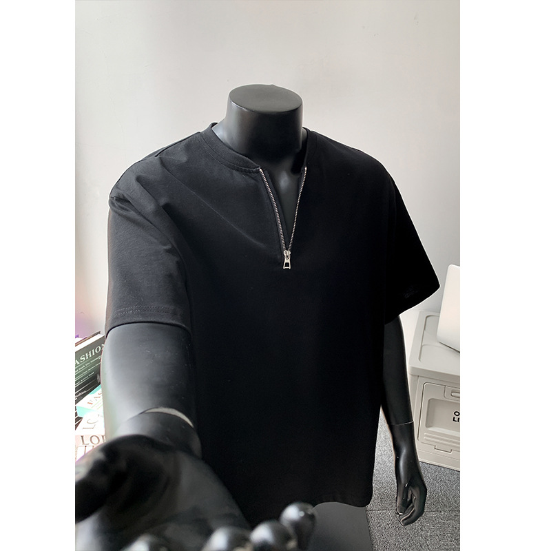 22025 ファッショナブルで多用途なトレンディなメンズ夏ハイウェイトハーフジップソリッドカラーコットン大きいサイズ半袖 T シャツ男性用