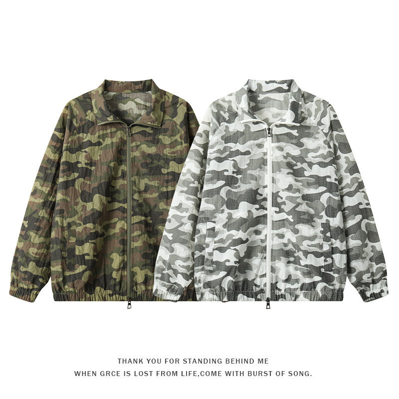 2025 ファッショナブルで多用途なトレンディなメンズ夏のアウトドアスタンドカラー迷彩メンズ大きいサイズ通気性速乾性日焼け止め服