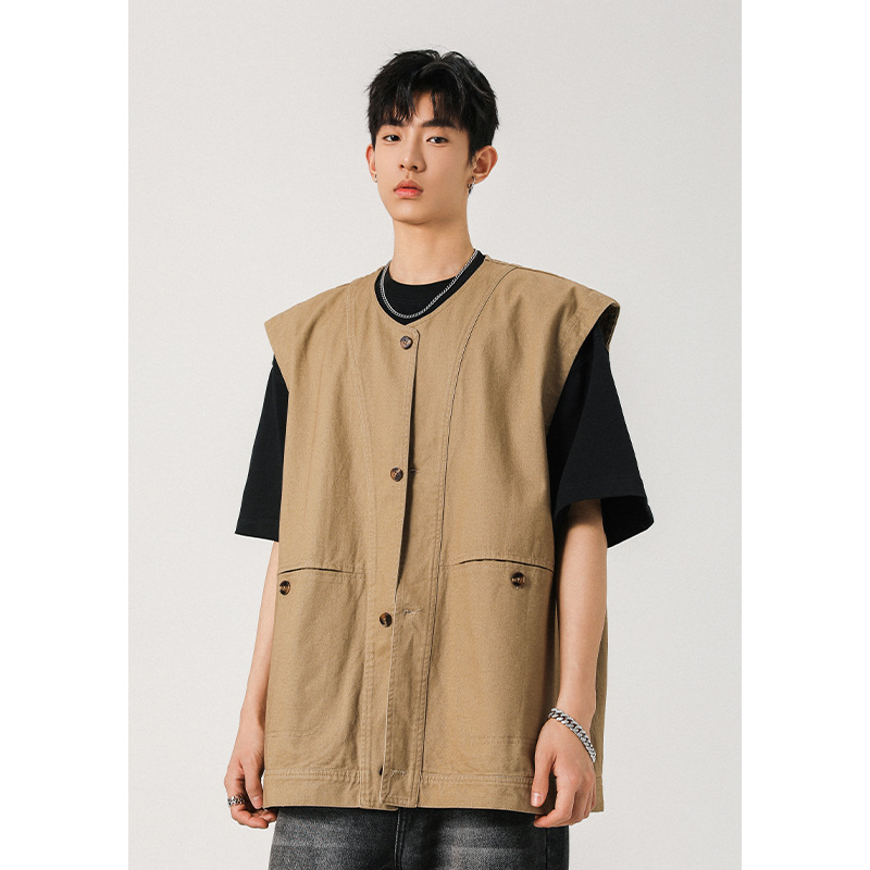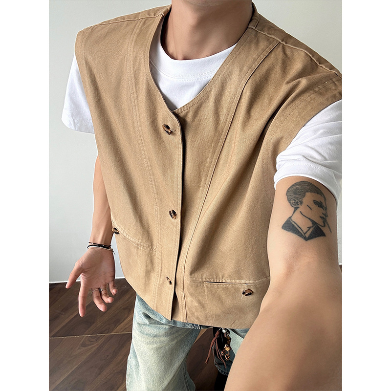 2025 ファッショナブルで多用途なトレンディなメンズ夏香港スタイル作業着スプライシングベストアメリカンルーズハンサムトップ