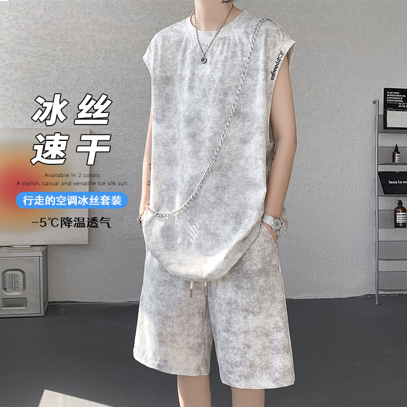 2025 ファッショナブルで多用途なトレンディなメンズタイダイレター刺繍大きいサイズアイスシルクベストショーツツーピースセット男性用