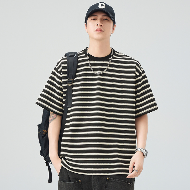 2025 新しい夏のストライプ Tシャツメンズ半袖ラウンドネックルーズ大きいサイズ Tシャツ多用途カジュアル日本トップトレンディ