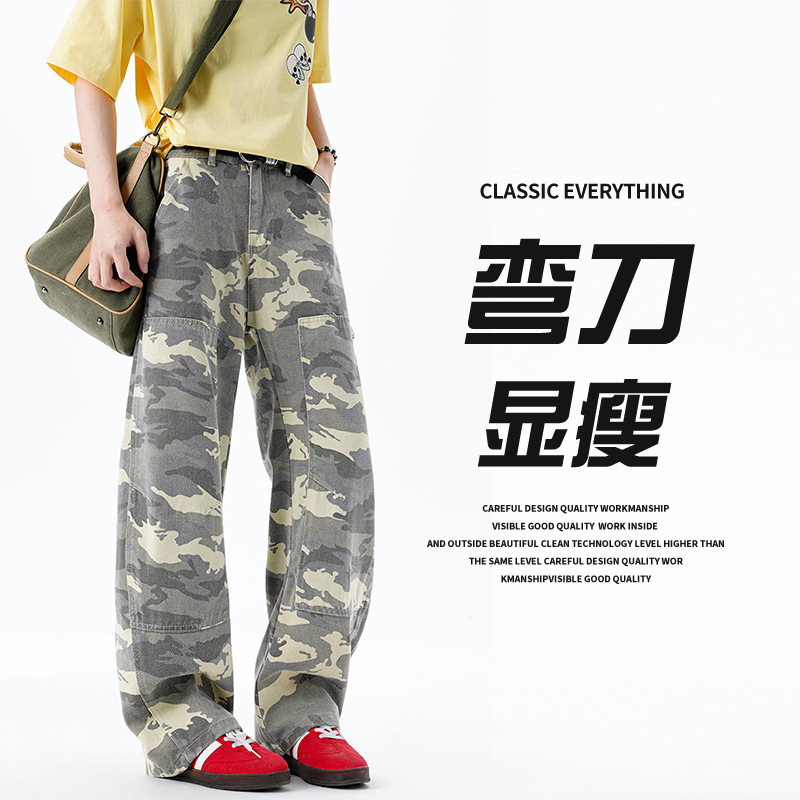 2025年新作 シミタールーズ迷彩イエロー トレンドアメリカンスタイルボタンモデル スポット韓国版ベーシックストレートタイプ 手描き