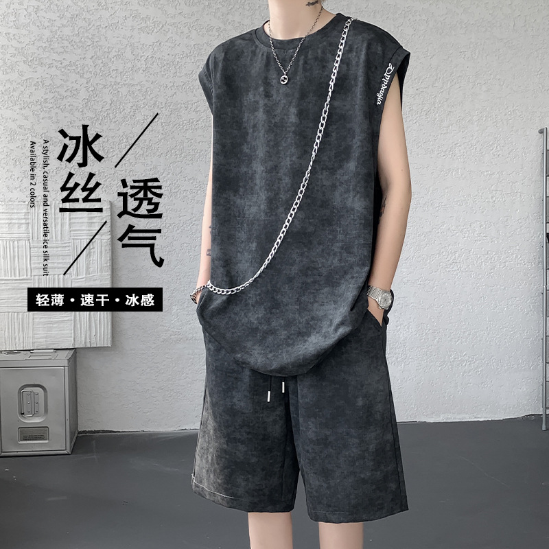 2025 ファッショナブルで多用途なトレンディなメンズタイダイレター刺繍大きいサイズアイスシルクベストショーツツーピースセット男性用