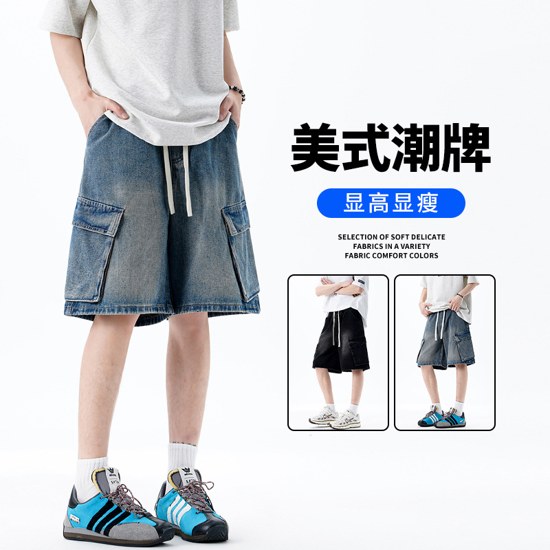 2025年ファッションデニムクォーターパンツ、デニムミッドパンツ、ヘビーデニムワークウェアクォーターパンツ、ビッグパッチブルー、在庫あり