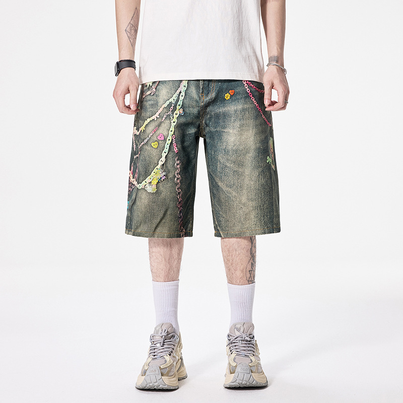 アメリカンレトロ3Dキャンディチェーンプリントデニムショートパンツメンズデザインストレートレッグルーズウォッシュドクロップドパンツ