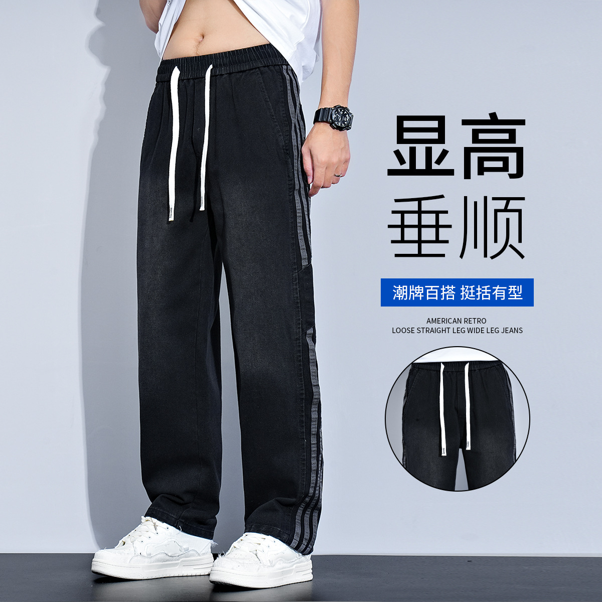 アメリカンストライプジーンズメンズトレンディレトロルーズストレートパンツウォッシュドレトロワイドレッグフロアレングスカジュアルパンツ