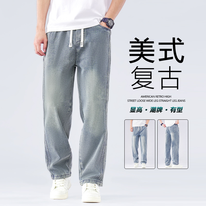 アメリカンレトロジーンズメンズトレンディな多用途ルーズストレートカジュアルパンツ2025新しいワイドレッグフロアレングスパンツ