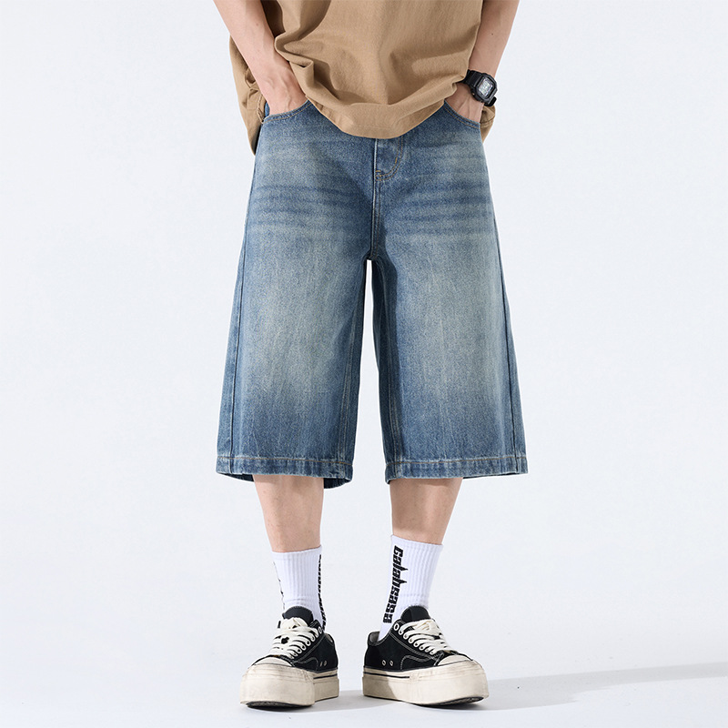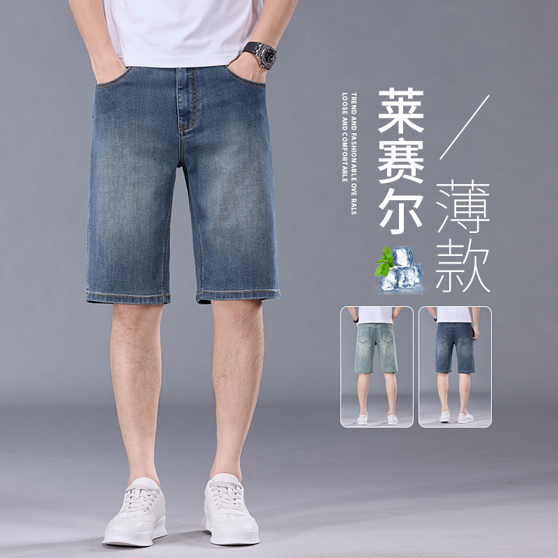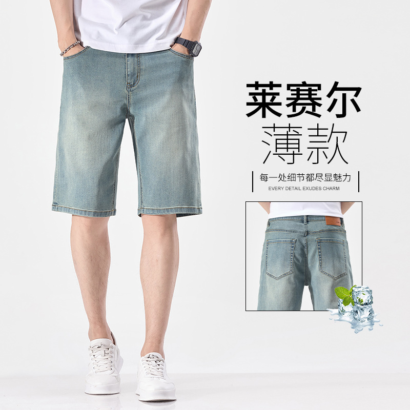 2025年夏人気のリヨセル5点パンツ、メンズミッドパンツ、6点パンツ、ストレートレッグルーズデニムショートパンツ、トレンド