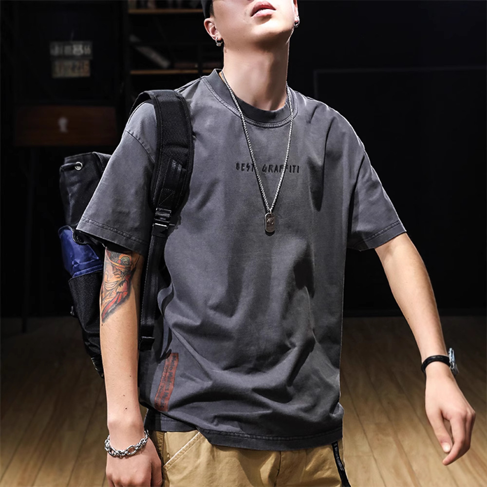Fenggeと同じスタイルのウォッシュ加工とダメージ加工を施したレーザープリントのメンズ半袖Tシャツ、アメリカンレトロなメンズ半袖Tシャツ、ヘビーウェイト、ゆったり、多用途