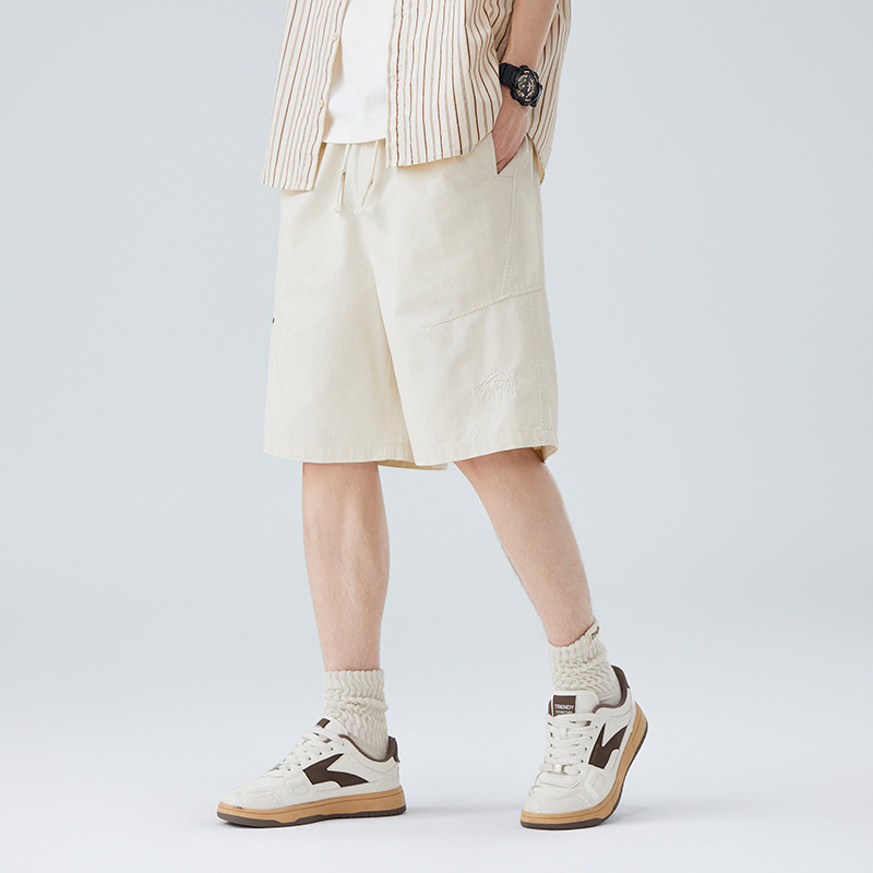 コーマウォッシュコットン夏薄手カジュアルショーツメンズルーズストレートトレンディブランドファッション万能5点パンツダークカーキ