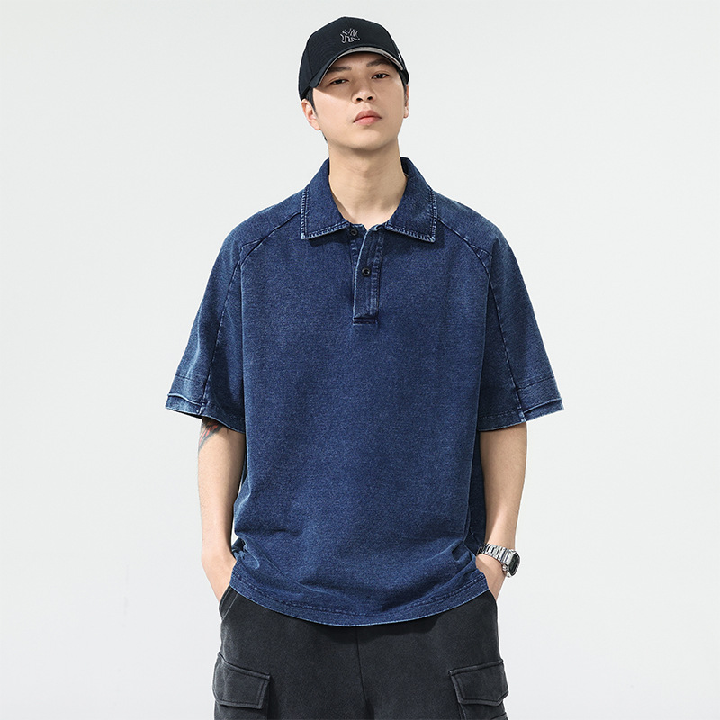 アメリカのレトロな重ポンドのデニムの青いpoloのシャツの男性の夏の半袖のゆったりしている襟のtシャツのファッションのブランドの男性の上着
