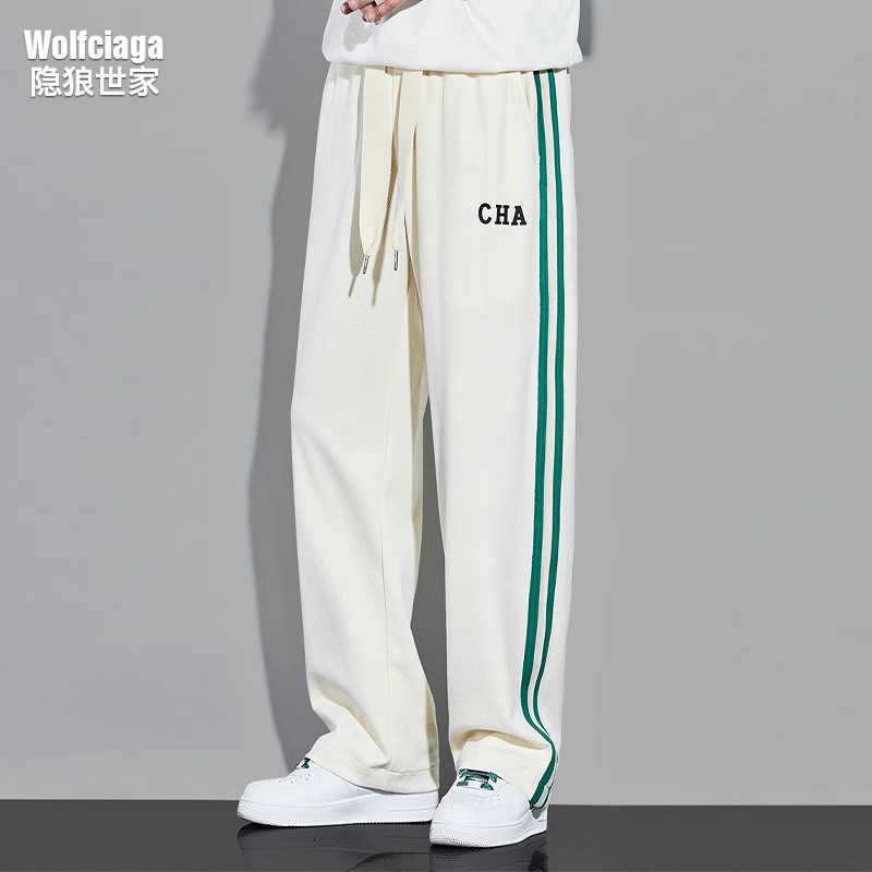 夏用メンズストレートカジュアルスウェットパンツ、ゆったりトレンドブランド、香港風ドレープワイドパンツ、薄手ストライプ万能スポーツパンツ