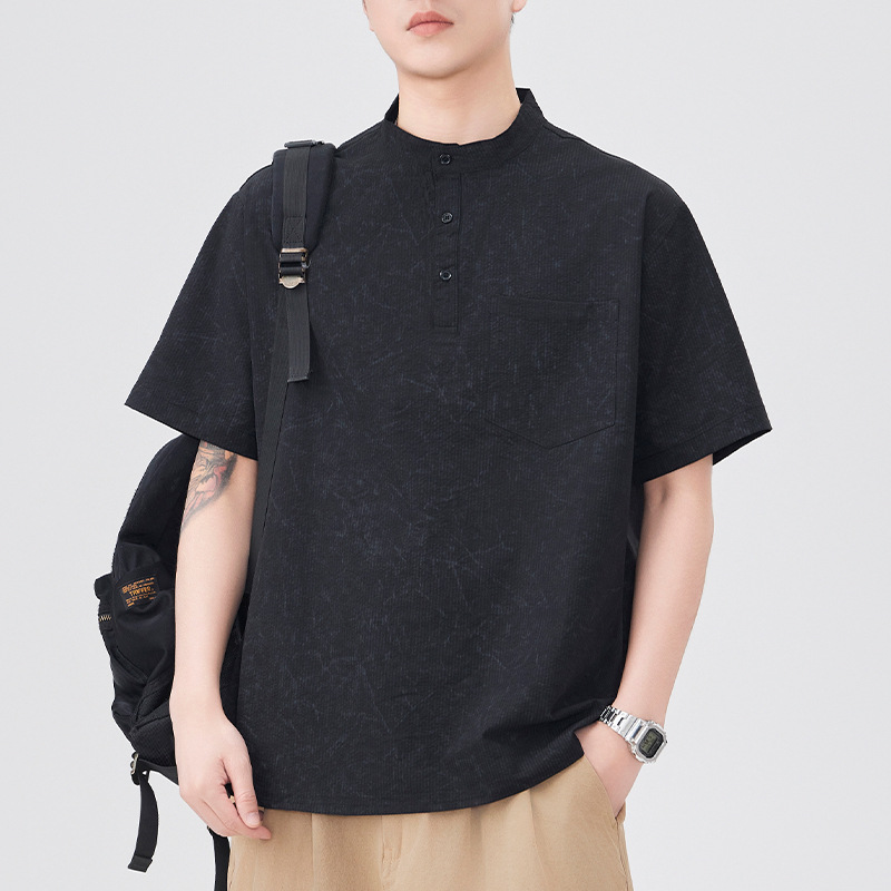 2025 新しい夏のアイスシルククールシルクサッカーヘンリーネックポロシャツメンズルーズトップ半袖 Tシャツ