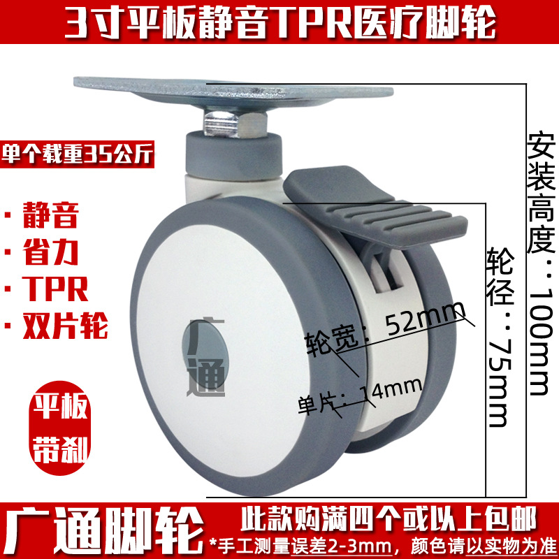 3インチユニバーサルブレーキ人工ゴム病院キャスターベッドカート机械tprゴム静音ステアリング二列ローラー