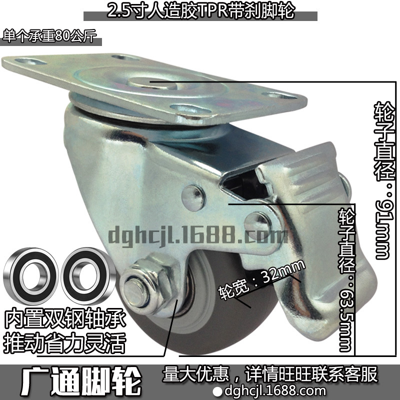 2.5インチ中型ユニバーサルブレーキ人造ゴムキャスター静音ダブルベアリングtprローラーホテル食堂カートプーリー