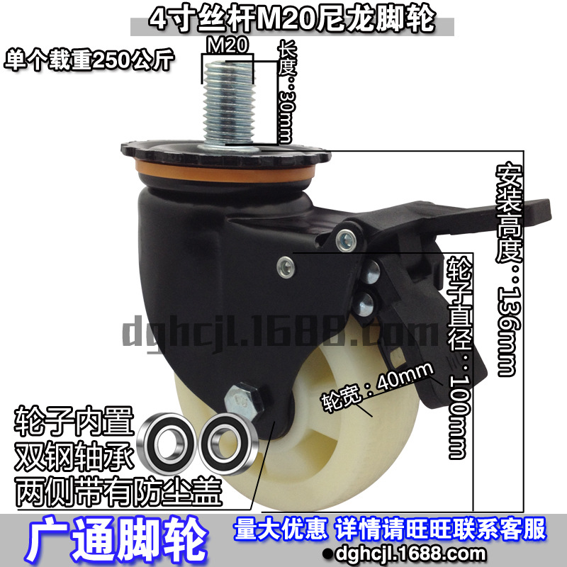 4インチ中型大型スクリューm20万方向ブレーキキャスター産業機械ダブルベアリングナイロン耐摩耗トロリーローラー