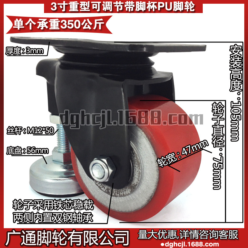 3インチ重自在鉄芯ポリウレタン足付きカップキャスター水平調節可能ローラー低重心耐摩耗puホイール