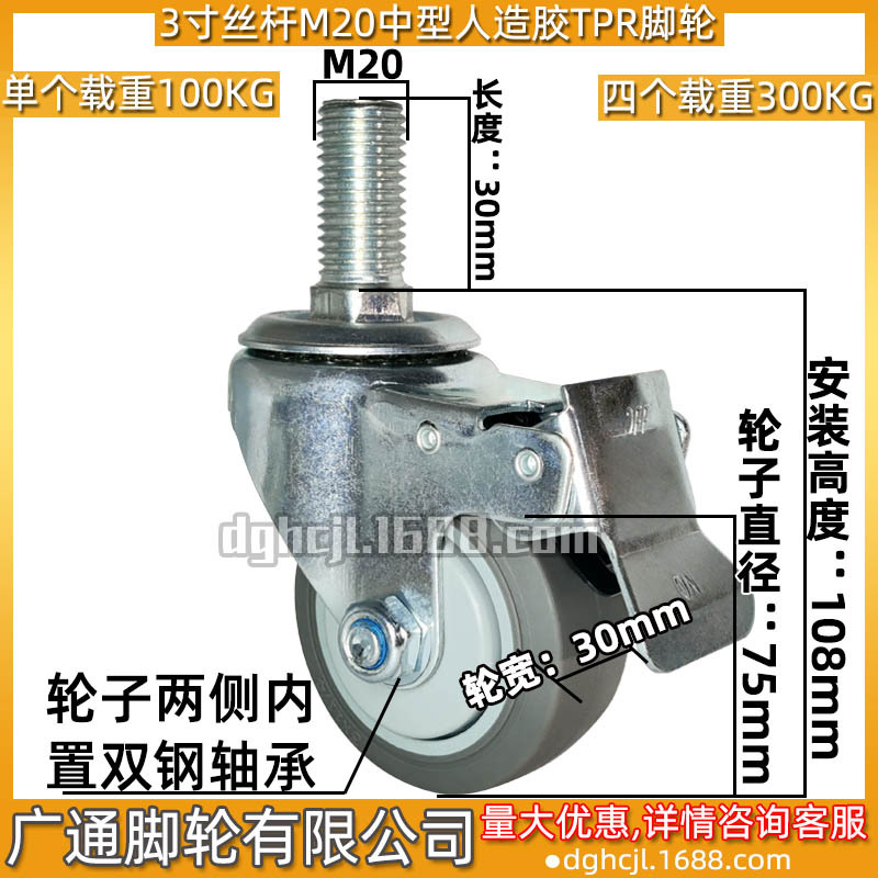 3インチm20スクリュー自在ブレーキtpr人造ゴムキャスター家具ホテル食堂車車車静音ゴムローラー