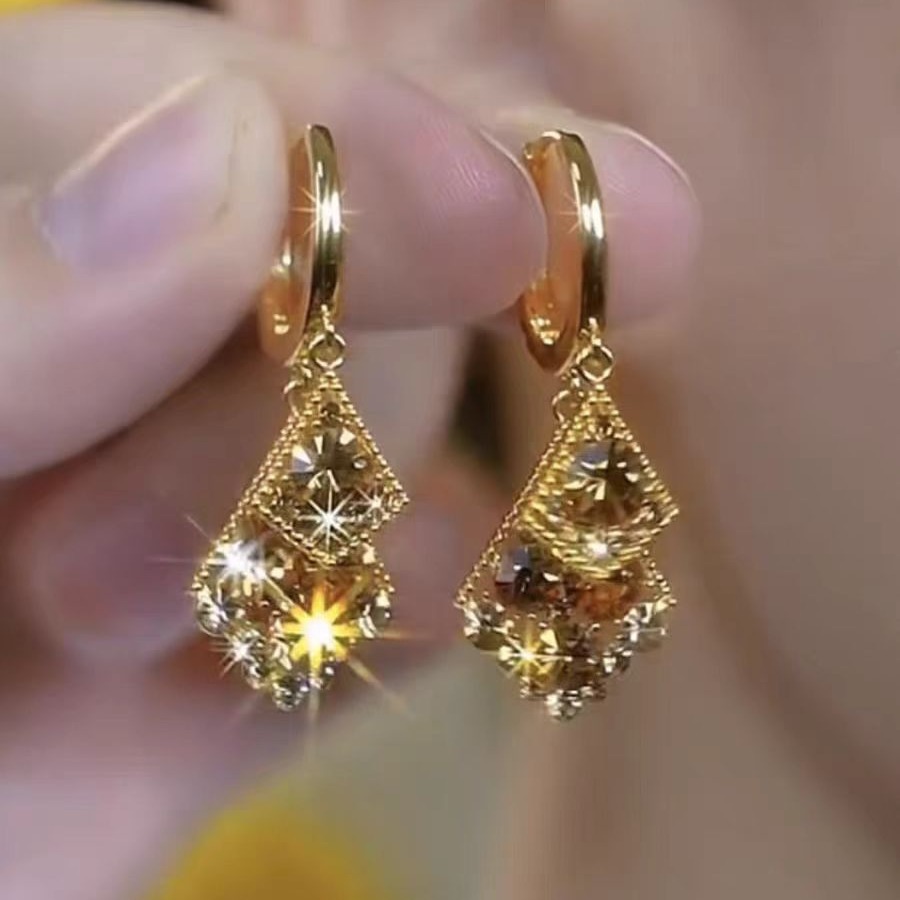 デザイン感美ラードカレー色ジルコン水晶ひし形イヤリング女性の軽贅沢高級感大気イヤリング耳飾り