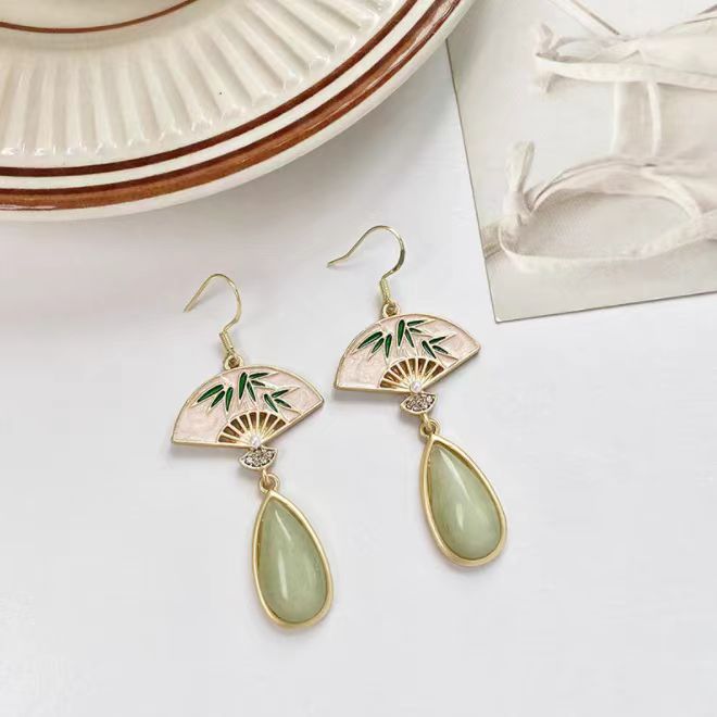 新中国式扇形緑竹長型フリンジイヤリング国風清冷気質高級感耳飾り2024新ファッション