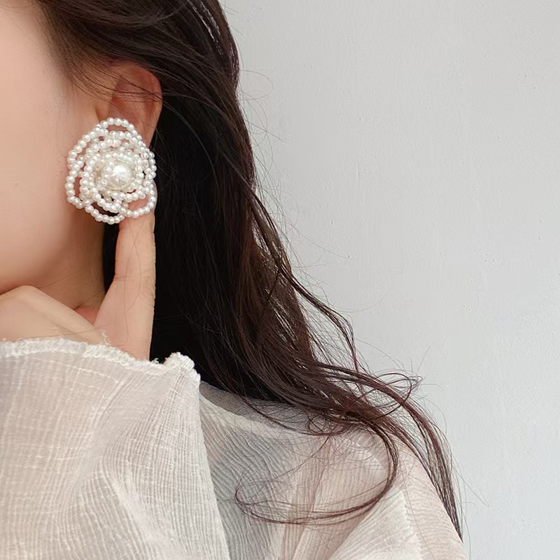 ネットセレブ人気パールピアス、スーパーフェアリーカメリアピアス、ホワイトビーズプレーンピアス、女性用気質ピアス