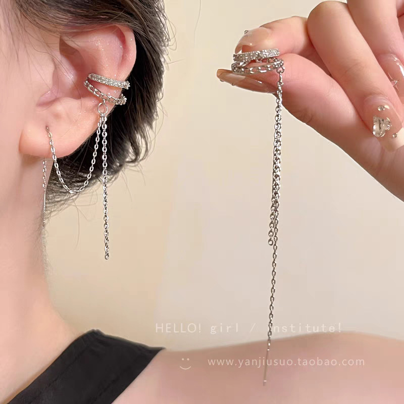 ファッショナブルなフルダイヤモンドのロングタッセルチェーンイヤークリップデザイン、女性のニッチな個性、ハイエンドのノンホールピアスイヤーフック