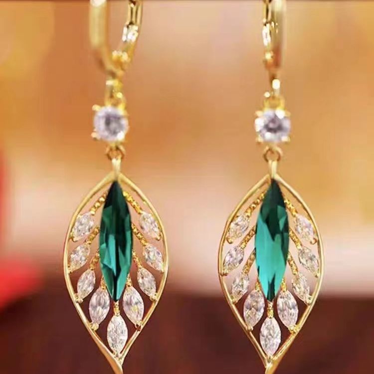 2023年に爆発した緑の木の葉ジルコン耳ボタンファッション気質百合ファッション個性高級感耳飾り