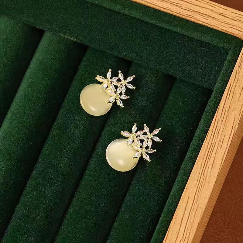 銀針高級感ジルコン猫眼石花イヤリングネット赤個性デザイン感ピアス軽贅沢耳飾り女
