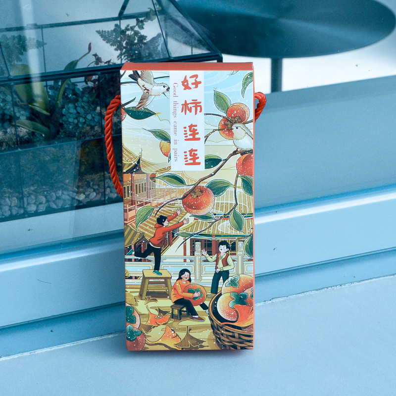 2粒の柿を入れて、手提げ箱の柿餅をプレゼントします。