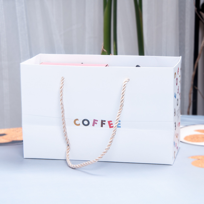 50個の白いスチールプリントのシンプルなコーヒーケースの手提げ袋には、10個包装のコーヒーケースを2箱入れることができます