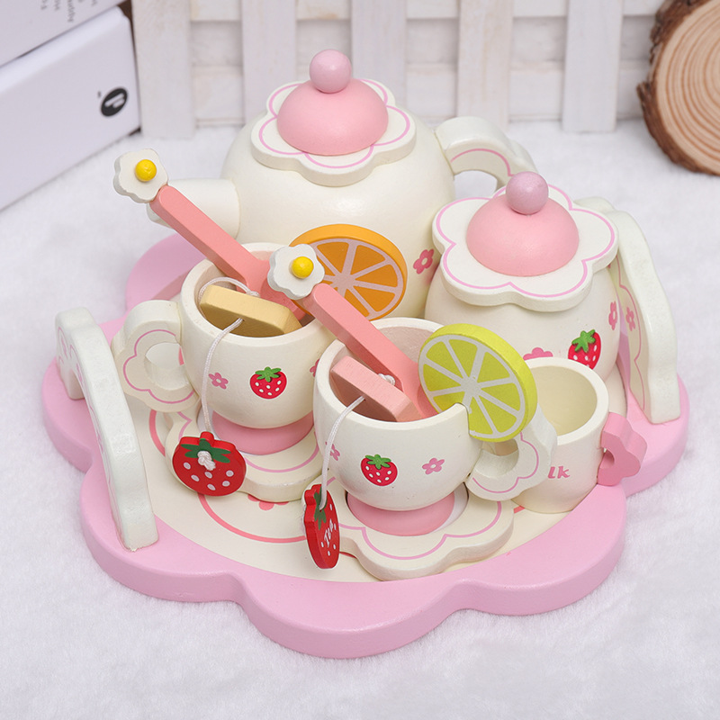 イチゴのティーポットのティーポットのデザートの益智は早く木のままごとを教えて白いティーポットの茶器の台所のおもちゃをシミュレーションします。