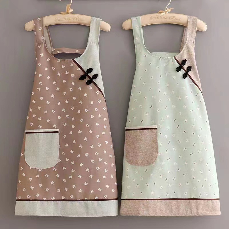 女性用の新鮮な中国風のボタン付きエプロン、国民的トレンドの綿、快適で通気性のある家事やケータリングの作業服、エプロンとサスペンダー