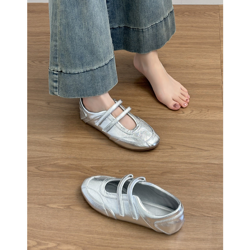 牛革の平の銀色のメアリー珍の靴の女性の本革の復古のマジックはバレエの靴のレジャーの運動の徳訓の靴を貼ります。