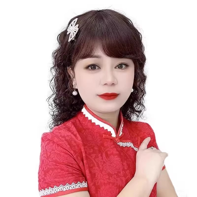 かつらレディースミドル丈巻き髪フルヘッドカバー模造髪中高年ファッションウール巻きママナチュラルかつらカバー
