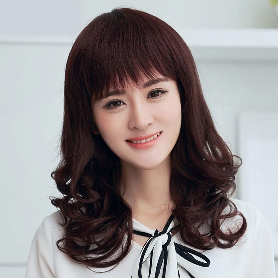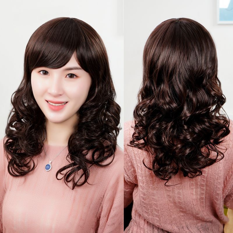 かつらの女性の長い巻き髪は全頭がリアルです。斜め前髪の中で長い髪をしています。