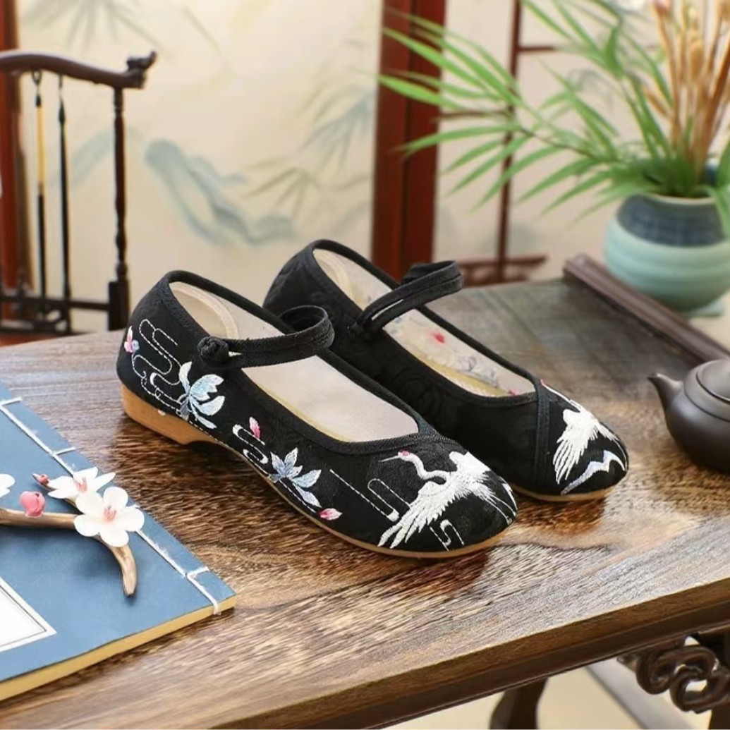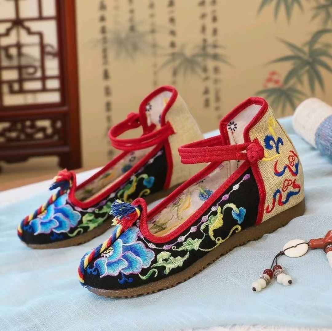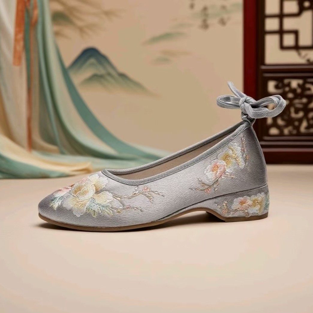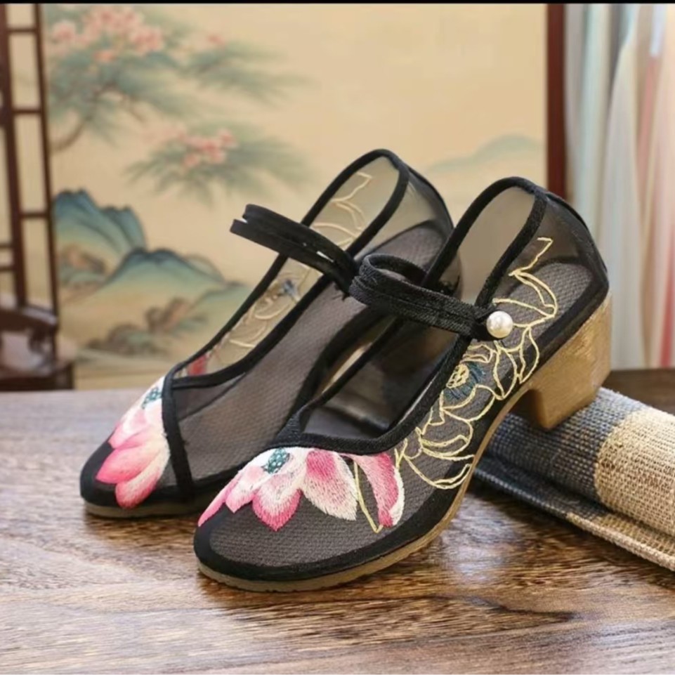 チャンキーヒールスクエアヒールレディースシューズ、ワンラインバックル浅口、春夏新作刺繍布靴、馬面スカートに合うハイヒール刺繍靴
