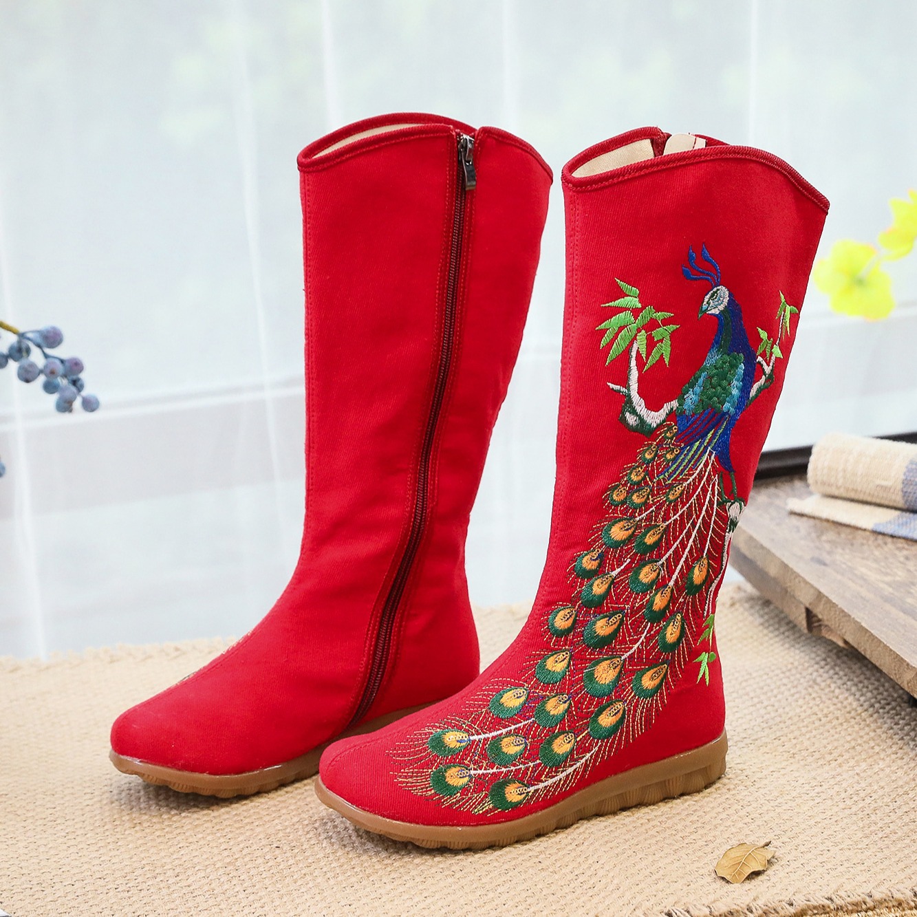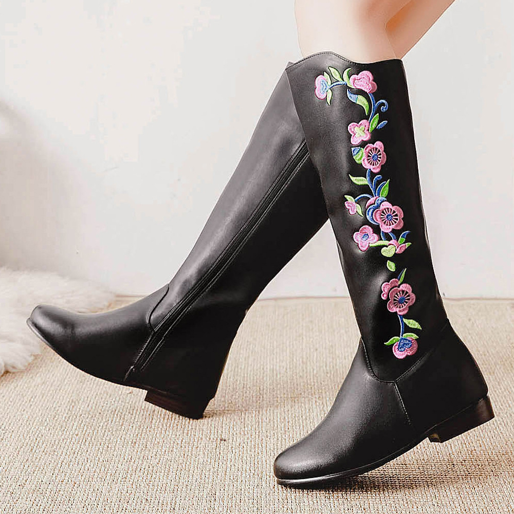ブーツは膝を越えないブーツの長いブーツファッションの厚い底の高い筒の刺繍の靴です。