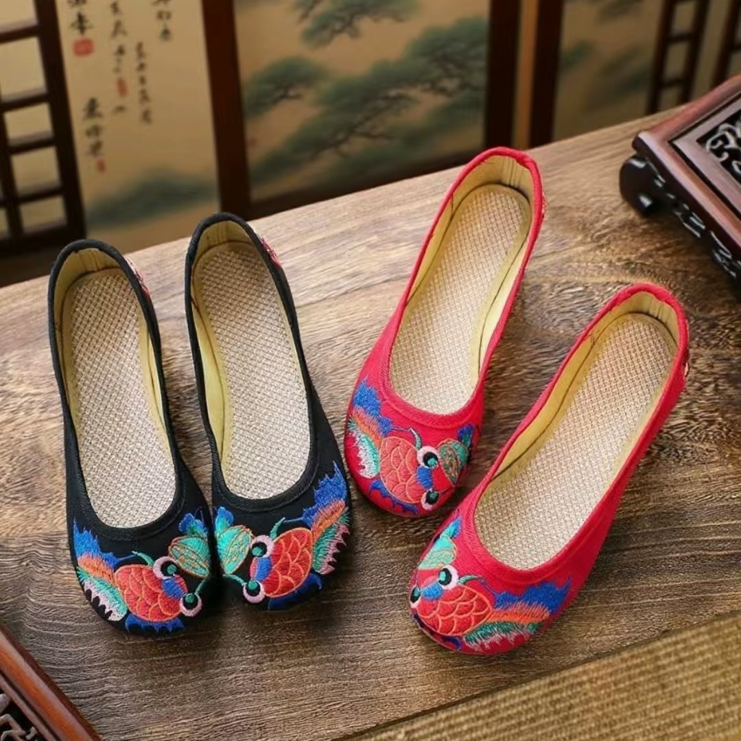 靴箱なし、ポインテッドトゥシューズ、シングルシューズ、春夏スタイル、牛すじ底婦人靴、バックル刺繍布靴、チャイナドレス婦人靴