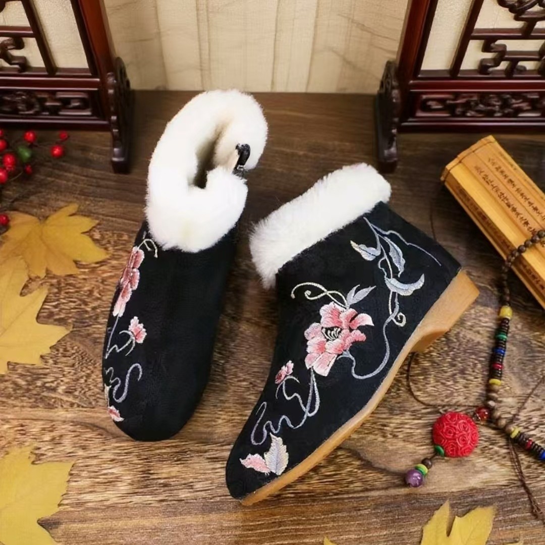 毛玉刺繍布靴少女低ヒール刺繍漢服靴時代劇舞台ダンス靴