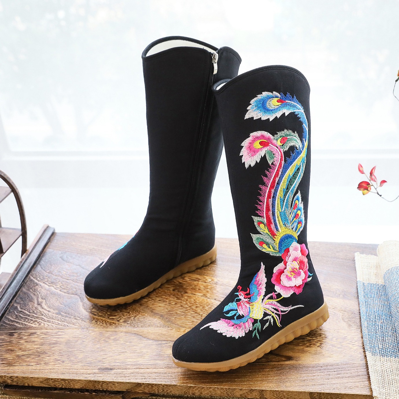 単靴綿靴中筒高筒靴刺繍布靴平底肥足大サイズ布靴刺繍女靴側ファスナー
