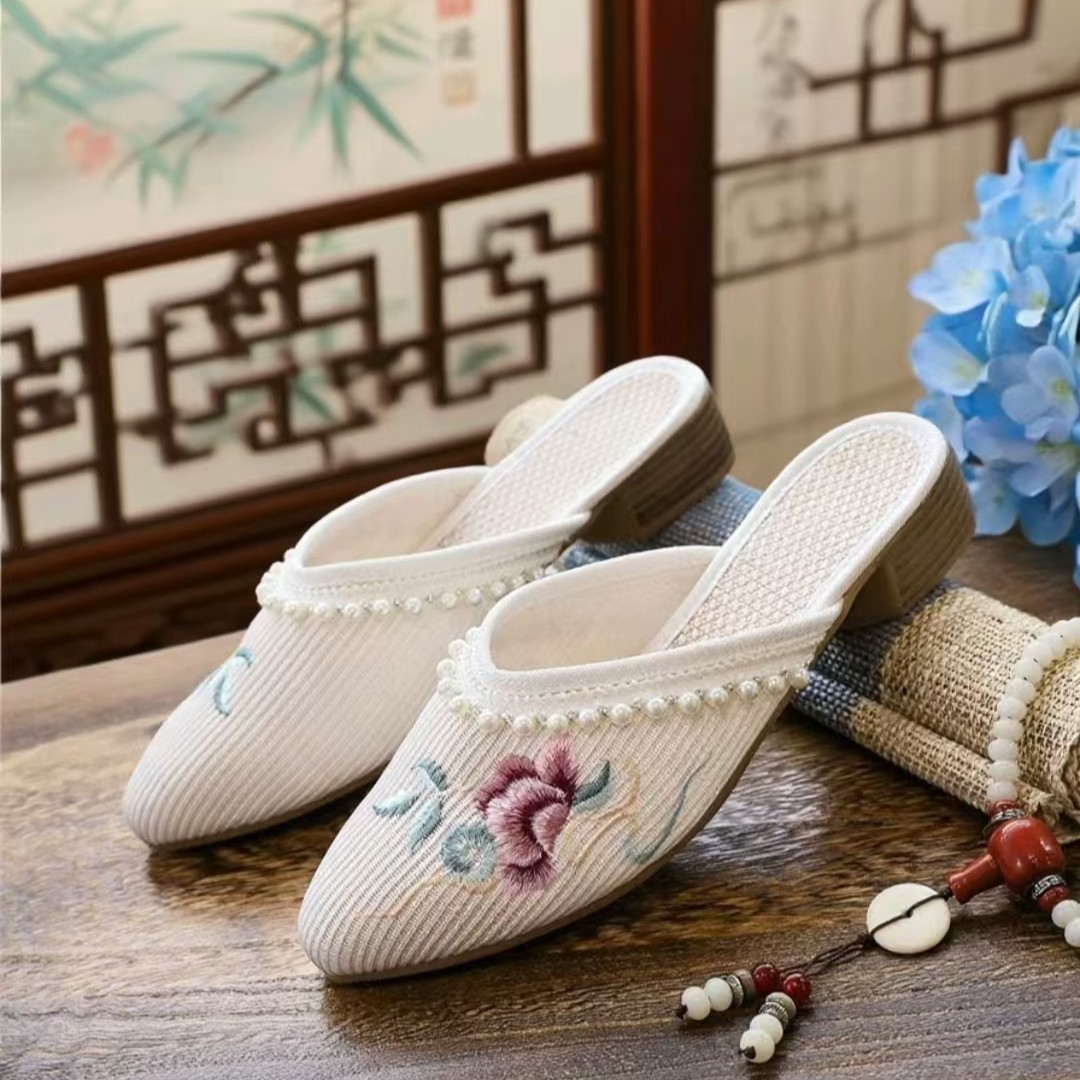 スリッパの亜麻の新型の頭の半分のスリッパの女性の夏の外は刺繍の布の靴の女性を着て涼しいです。