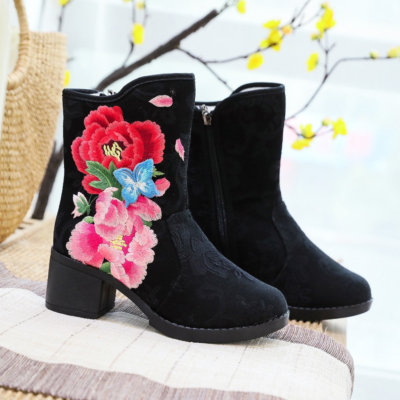 弓靴漢服靴単靴/綿靴時代の古風秋冬の女性の首を長くして花の布の靴を刺繍します。