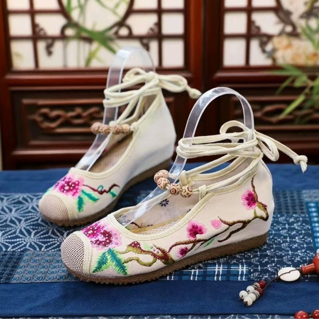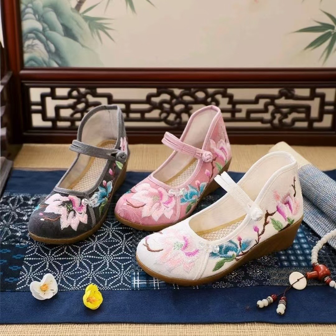 ハイヒール単靴牛筋底刺繍布靴玉蘭刺繍女靴民族風水晶ボタン