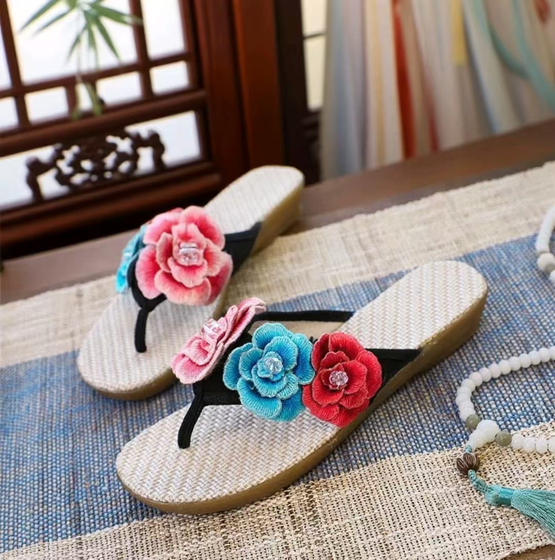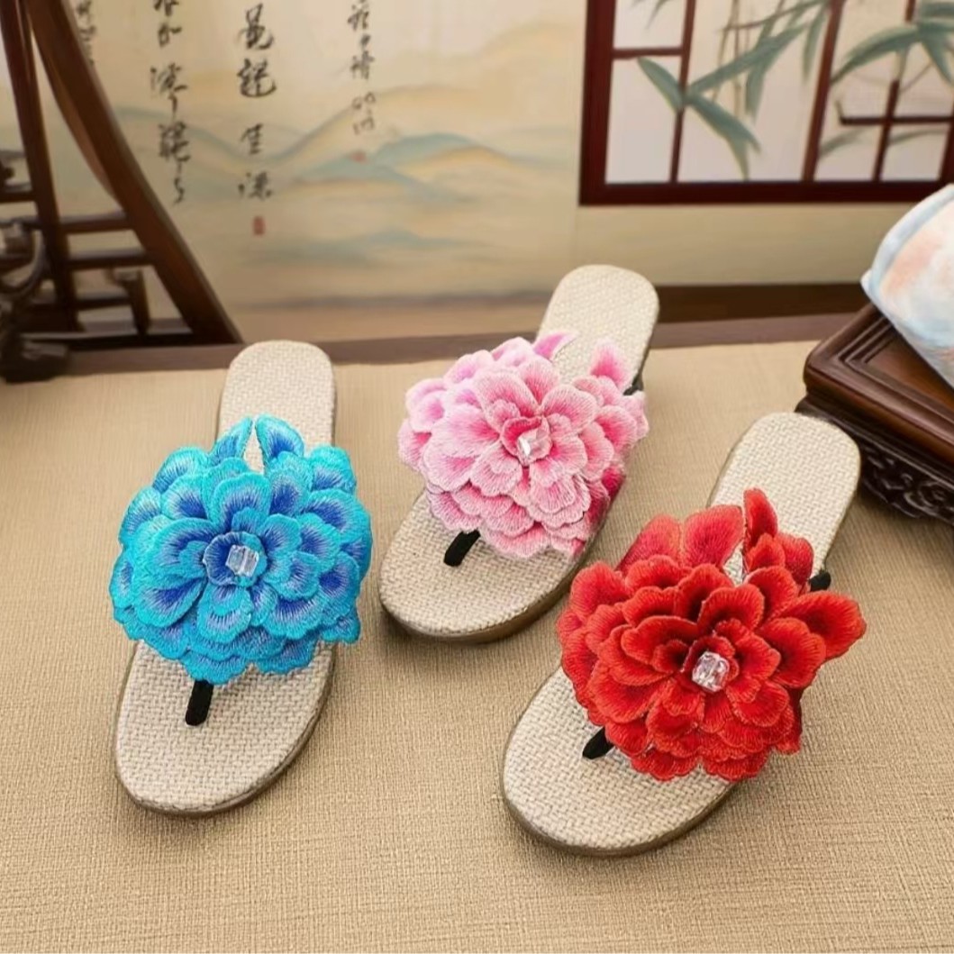 スリッパの人の字は平底の牛の筋肉の底を引きずって刺繍の布の靴のスリッパの玉の砂浜の女性の冷たいスリッパを打ちます。
