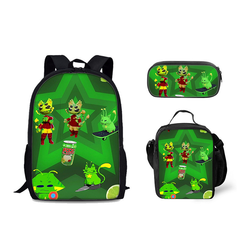 Regretevator Gnarpyゲームプリントリュックサック緑の猫のカバンの食事の包みのペンの袋の3つのセット