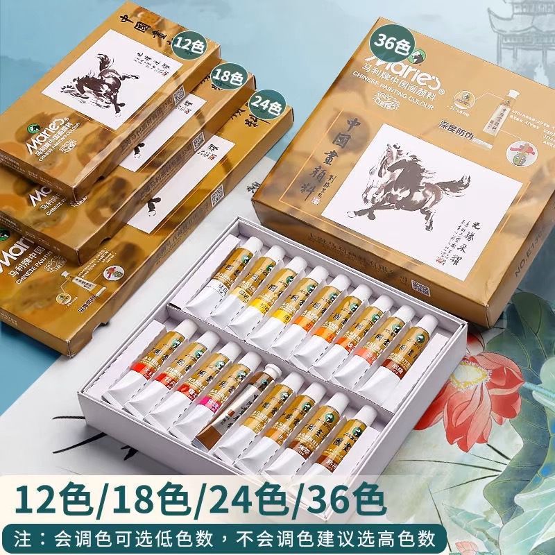 マリ国画絵の具セットe1301水墨画初心者入门中国画セット12色18色24色