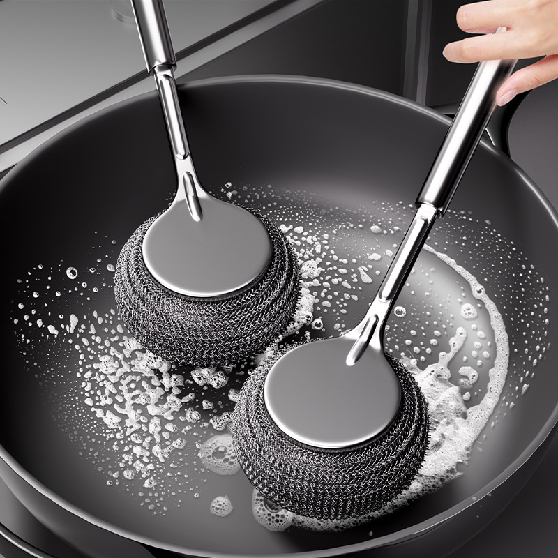 キッチンステンレス鍋ブラシ、長柄食器洗いブラシ、鍋洗い専用鋼球、糸が抜けない鍋洗い加工品